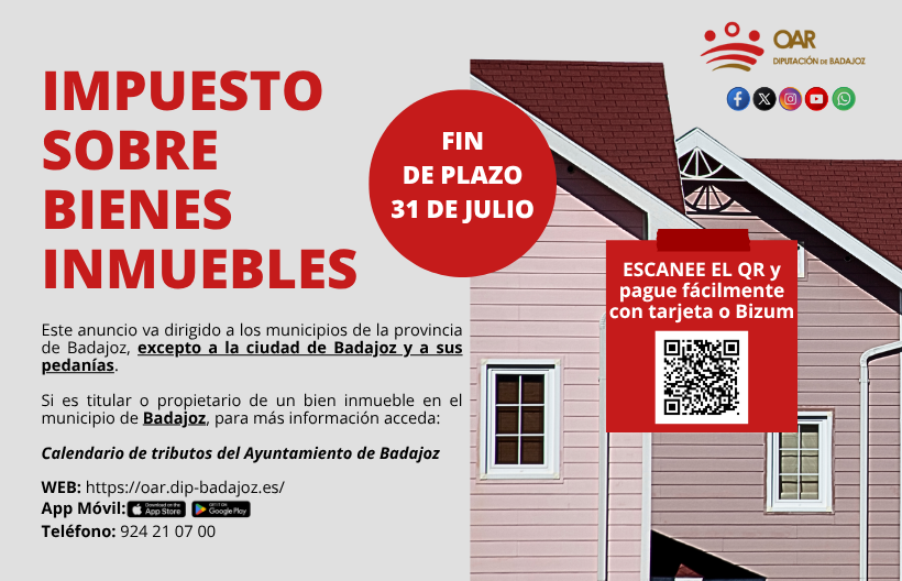 Igualmente, si dispone de medios electrónicos (certificado digital o Cl@ve) puede hacerlo a través de la Oficina Virtual del OAR (https://oarvirtual.dip-badajoz.es/ciudadanos), y las Aplicaciones móviles para iOS y Android (buscando "OAR Badajoz" en las tiendas oficiales), para la consulta, descarga y pago de recibos.