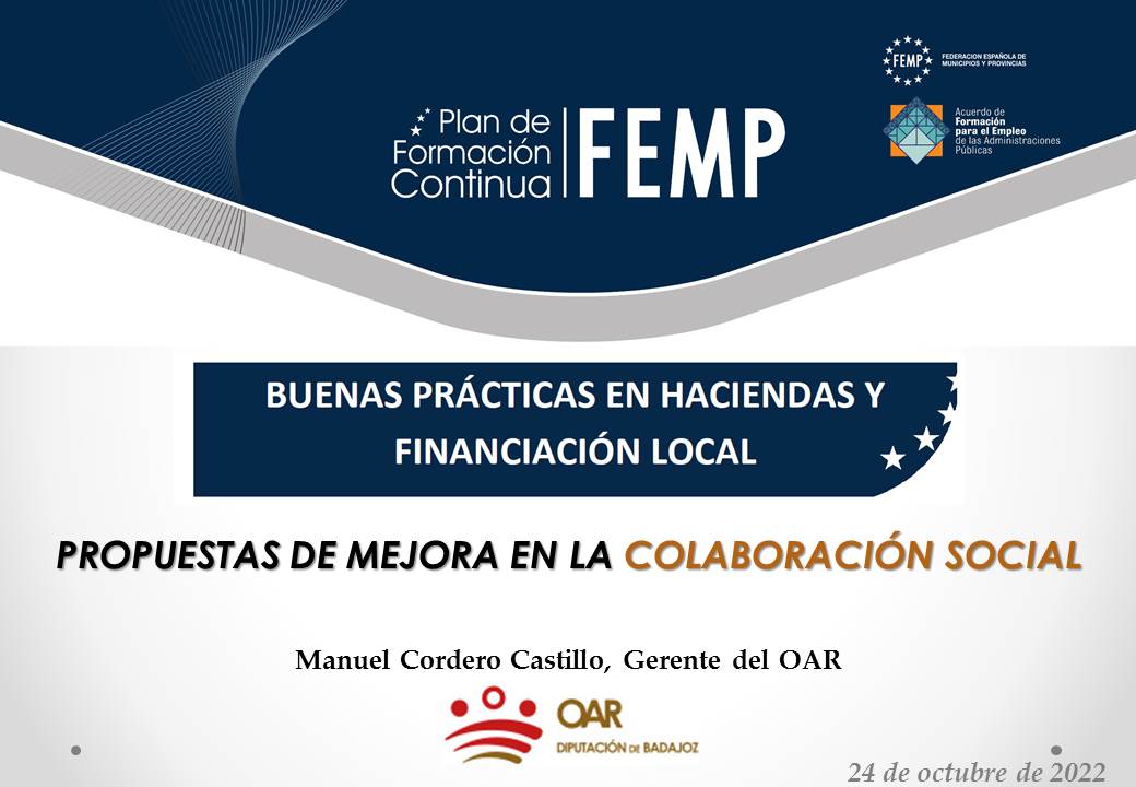 El Gerente del OAR, Manuel Cordero, ha participado como ponente en las Jornadas Formativas de Buenas Prácticas en Haciendas y Financiación Local, impartidas por la Federación Española de Municipios y Provincias - FEMP, desarrollado dentro del Programa de Formación Permanente de la federación, teniendo la oportunidad de compartir experiencias en materia de colaboración con otras Administraciones Públicas, poniendo de manifiesto la importancia que tiene la colaboración social, para llevar a cabo la gestión y recaudación tributaria de forma eficiente y ágil.