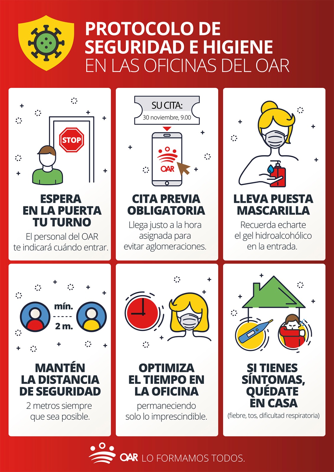 El OAR ha editado un cartel en el que ofrece información relativa a las condiciones en que se ofrece la atención, habiendo procedido previamente a dotar a las oficinas del material necesario para cumplir las medidas que la Diputación de Badajoz ha establecido para todos sus centros de trabajo, en consonancia con las normas y consejos de las autoridades sanitarias.