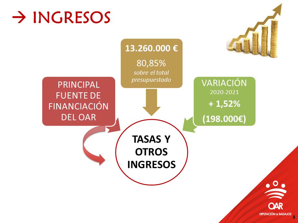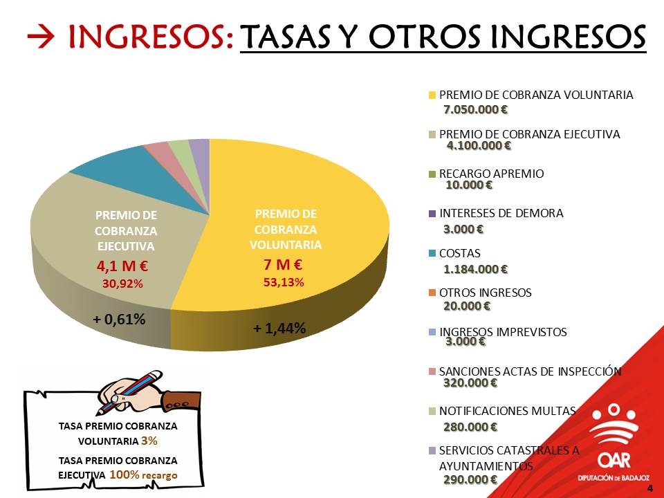 El 80,85% del presupuesto de ingresos está representado por la partida de Tasas y otros ingresos, en la que destaca principalmente la Tasa por prestación de servicio que el OAR cobra en relación con la gestión, liquidación, inspección y recaudación de los tributos delegados por los Ayuntamientos y otras entidades. Los ingresos presupuestados por el premio de cobranza en voluntaria y ejecutiva alcanzan los 11 millones de euros.