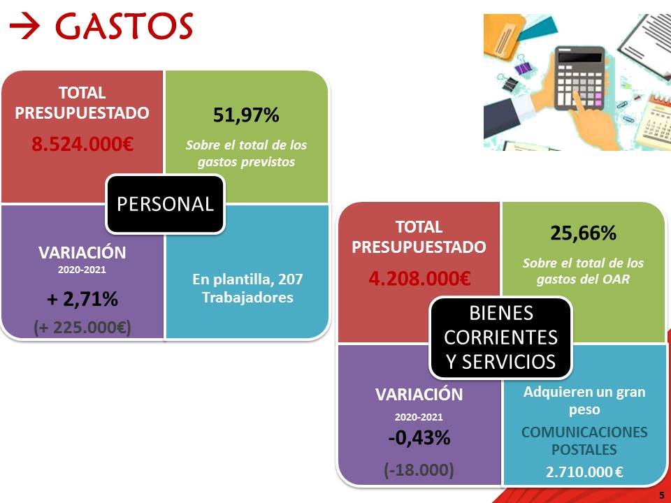 En materia de gastos, el capítulo de personal asciende a los 8,5 millones, más de la mitad que el montante global del presupuesto 2021. Es especialmente destacable el alto volumen de gastos en comunicaciones postales al que el Organismo hace frente por importe de 2.710.000 euros, un 16,5% respecto al total presupuestado.