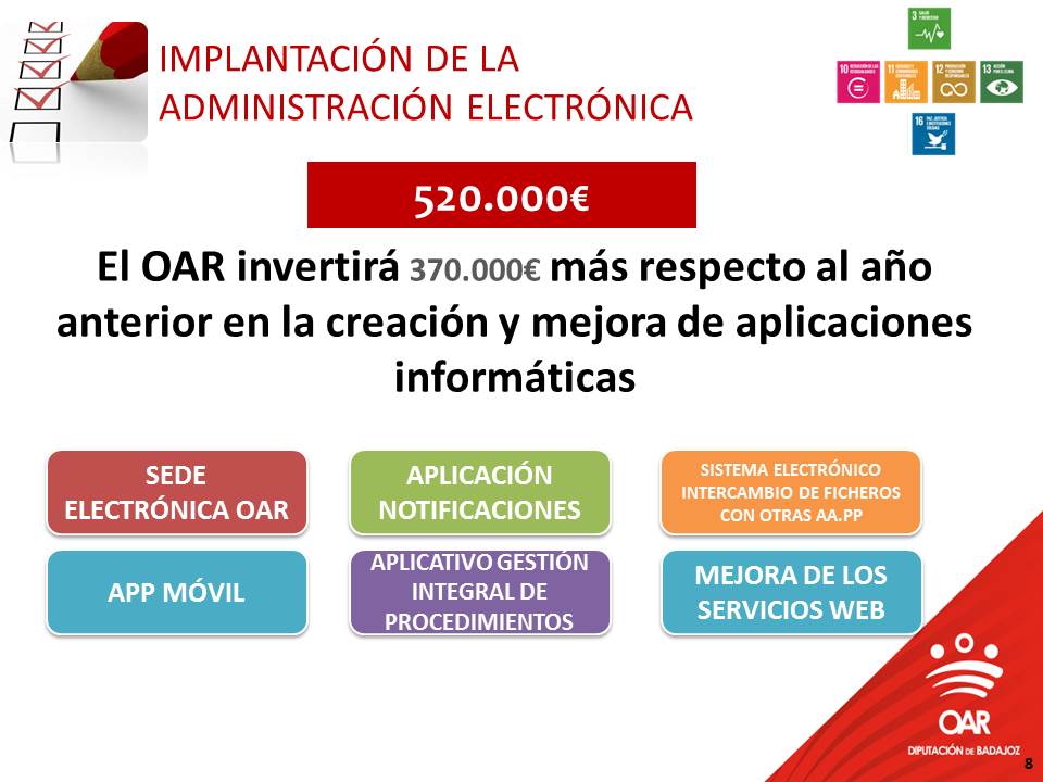 El Presupuesto del OAR para el año 2021 también contempla la apuesta por la implantación de la Administración electrónica, para lo que invertirá la cantidad de 520.000 euros, es decir, 370.000 euros más que en el ejercicio anterior. Dicha inversión está orientada a la puesta en marcha de una sede electrónica, con el fin de facilitar a la ciudadanía la gestión integral de los trámites tributarios, la creación de una APP, entre otras novedades informáticas en busca de la simplificación administrativa.
