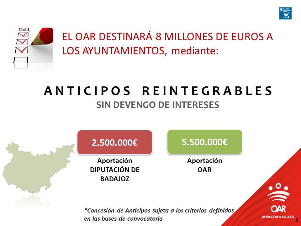 Otra de las novedades que contiene el Presupuesto es la puesta a disposición de los Ayuntamientos de 8 millones de euros mediante anticipos reintegrables sin coste, al no suponer ningún tipo de interés. Esta medida, hasta ahora gestionada por el Área de Economía y Hacienda de la Diputación de Badajoz, se incluye para este ejercicio en el Presupuesto del OAR para lo que la Diputación ha inyectado en aquel un total de 2,5 millones euros, cantidad que se complementa con 5,5 millones euros procedentes de los buenos resultados arrojados por el Organismo en remante de tesorería.