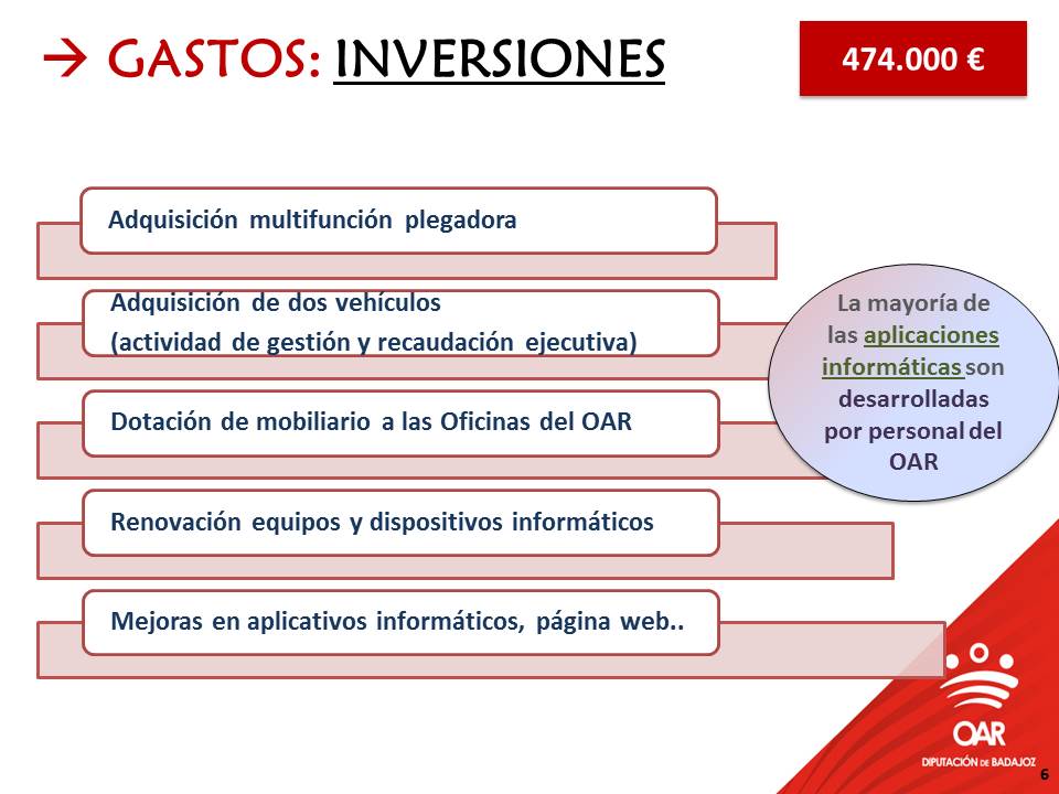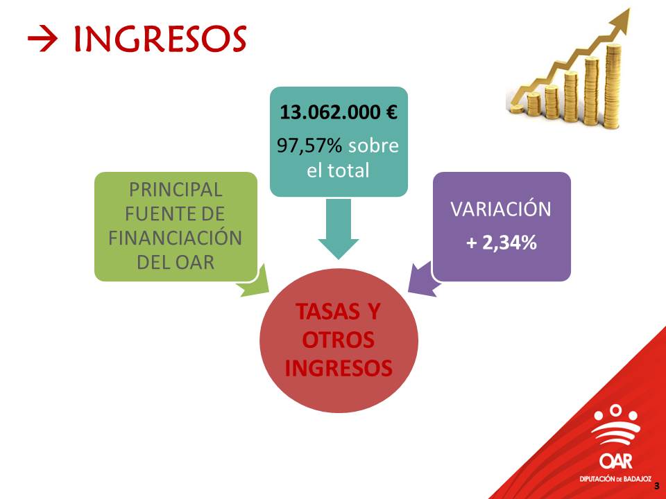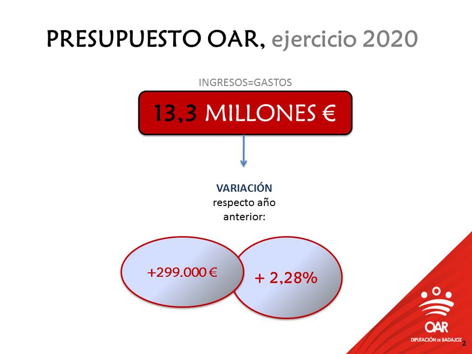 Éste se sitúa en 13.387.000€, registrando un incremento respecto al año anterior de 2,28% (299.000€). Respecto al Presupuesto de Ingresos, dicho aumento es consecuencia de los buenos resultados y avance positivo que en estos últimos años ha alcanzado la recaudación de los ingresos de derecho público delegados al OAR por los municipios de la provincia.