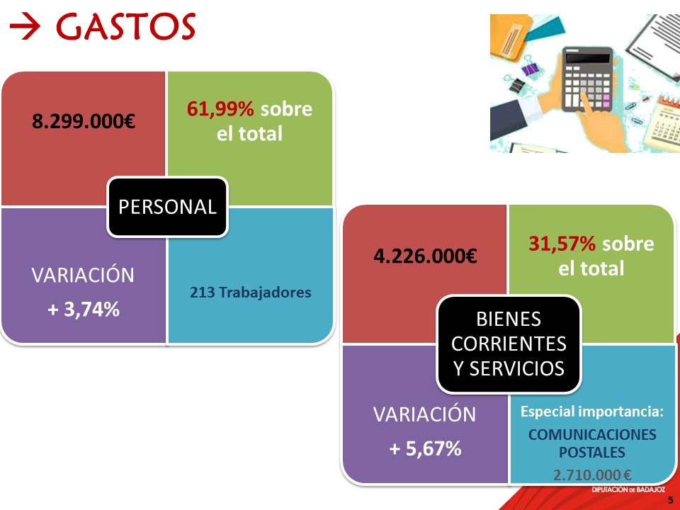 En el Presupuesto de Gastos, por su importancia en cuanto al volumen que representa respecto al presupuesto total, destaca los gastos del personal (presupuestado en 8.299.000€). Muestra una variación positiva de 3,74% debido al incremento del 3% en previsión de lo que estipule la Ley de Presupuestos del ejercicio 2020 u otra normativa, la carrera profesional y jubilaciones existentes.