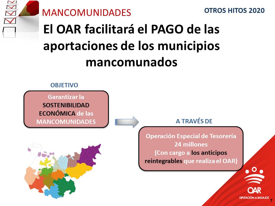 Son tres las líneas que adquieren especial importancia en los Presupuestos del OAR para el año 2020. La primera, centrada en las Mancomunidades, con la que el OAR facilitará el pago de los municipios mancomunados para garantizar la sostenibilidad económica de aquellas a través de la Operación Especial de Tesorería con cargo a los anticipos reintegrables que realiza el OAR.
