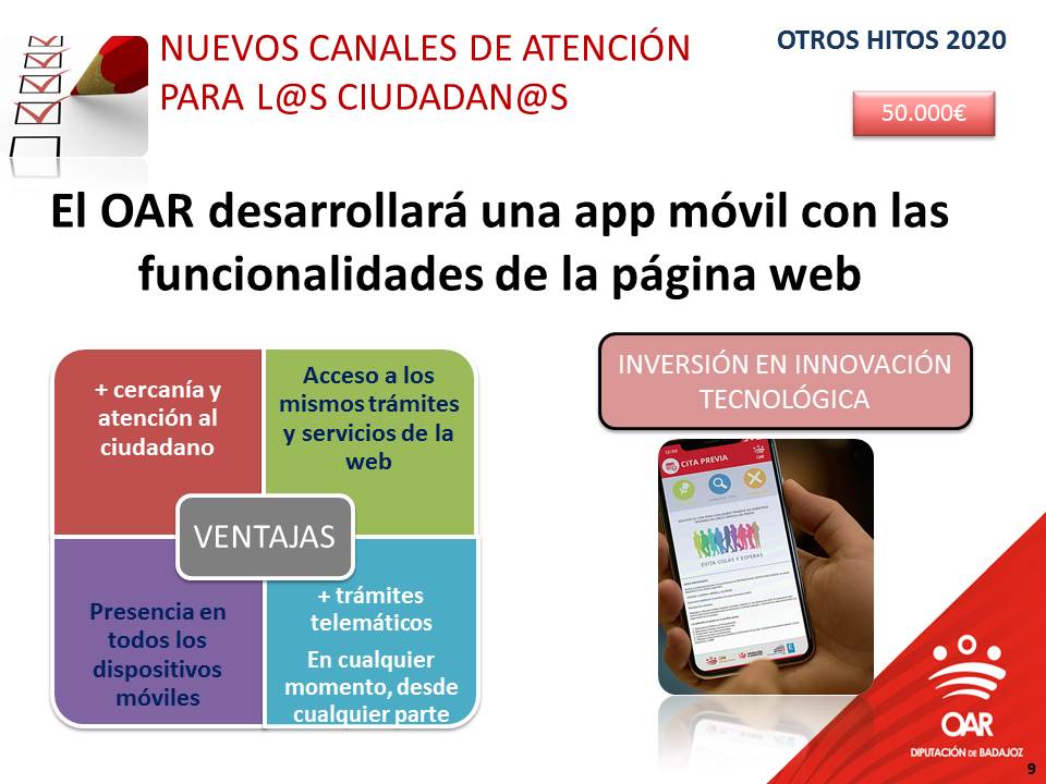 Por último, se llevará a cabo el desarrollo de una app móvil para que los/as ciudadanos/as puedan consultar información tributaria actualizada, así como, a la realización de trámites desde sus dispositivos móviles con la finalidad de dar cumplimiento a sus obligaciones tributarios de forma sencilla y accesible para ellos, en cualquier momento y desde cualquier parte.