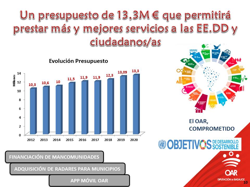 En la mañana de ayer, el diputado delgado del OAR, D. Saturnino Alcázar Vaquerizo, y el Gerente del OAR, D. Manuel Cordero Castillo han comparecido en rueda de prensa de la Diputación de Badajoz para presentar el Presupuesto que va a regular el funcionamiento del Organismo el próximo ejercicio. Este presupuesto, destaca el Diputado, ha sido elaborado con clara vinculación en el cumplimiento de los Objetivos de Desarrollo Sostenible (ODS)