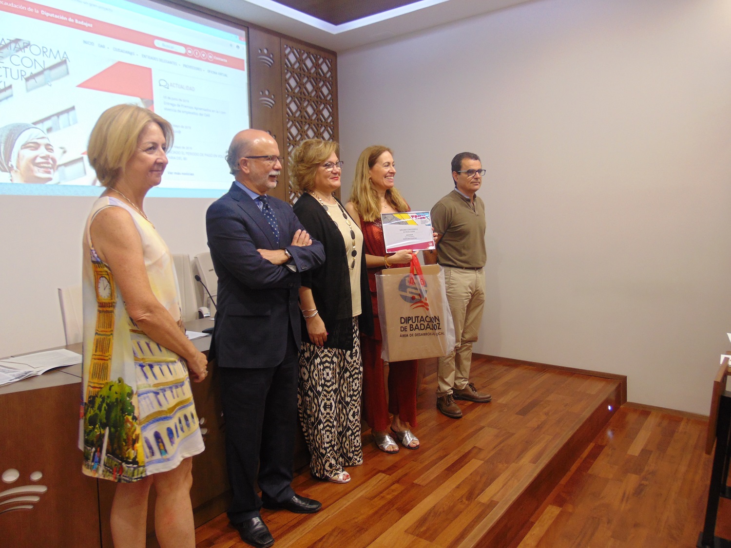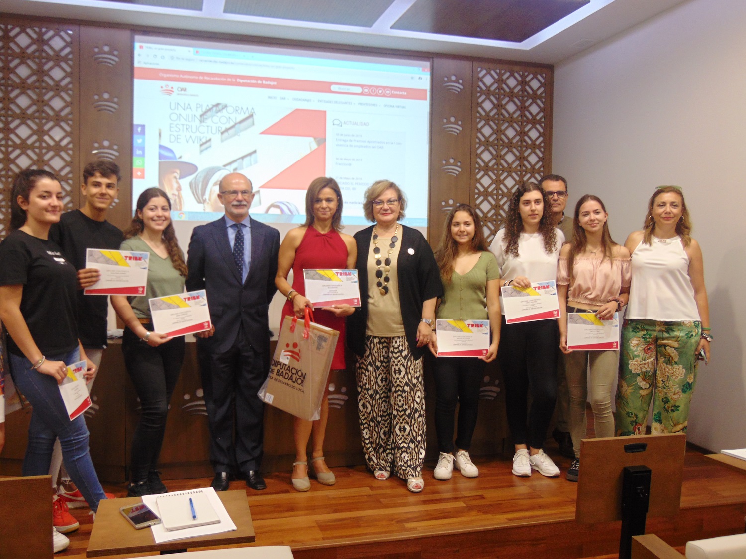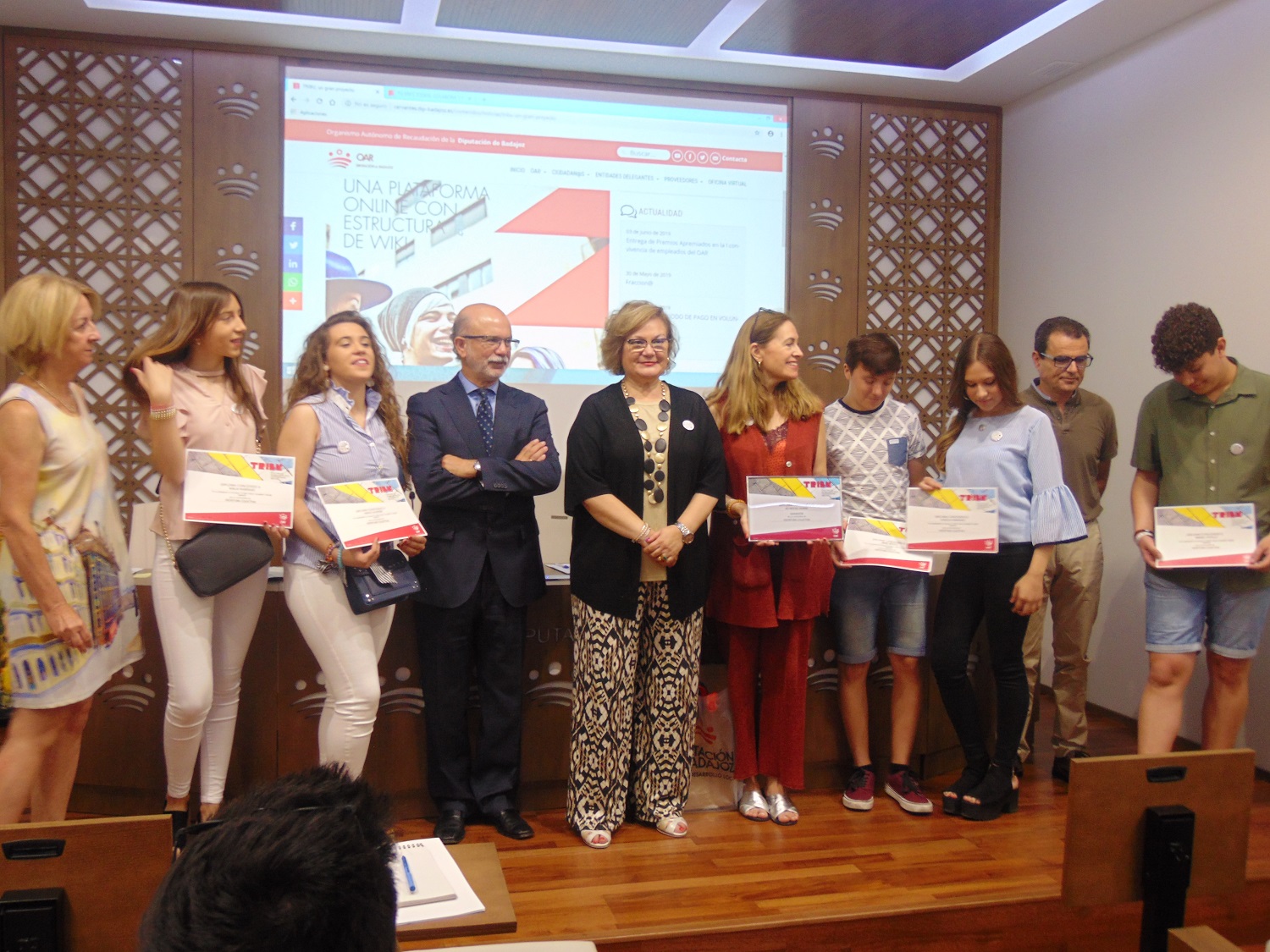 La diputada del OAR Mª del Rosario Moreno junto al gerente Manuel Cordero y Jaime Gragera coordinador de informática y administración digital han entregado esta mañana los premios a los mejores proyectos presentados en la plataforma WIKI de TRIBU.