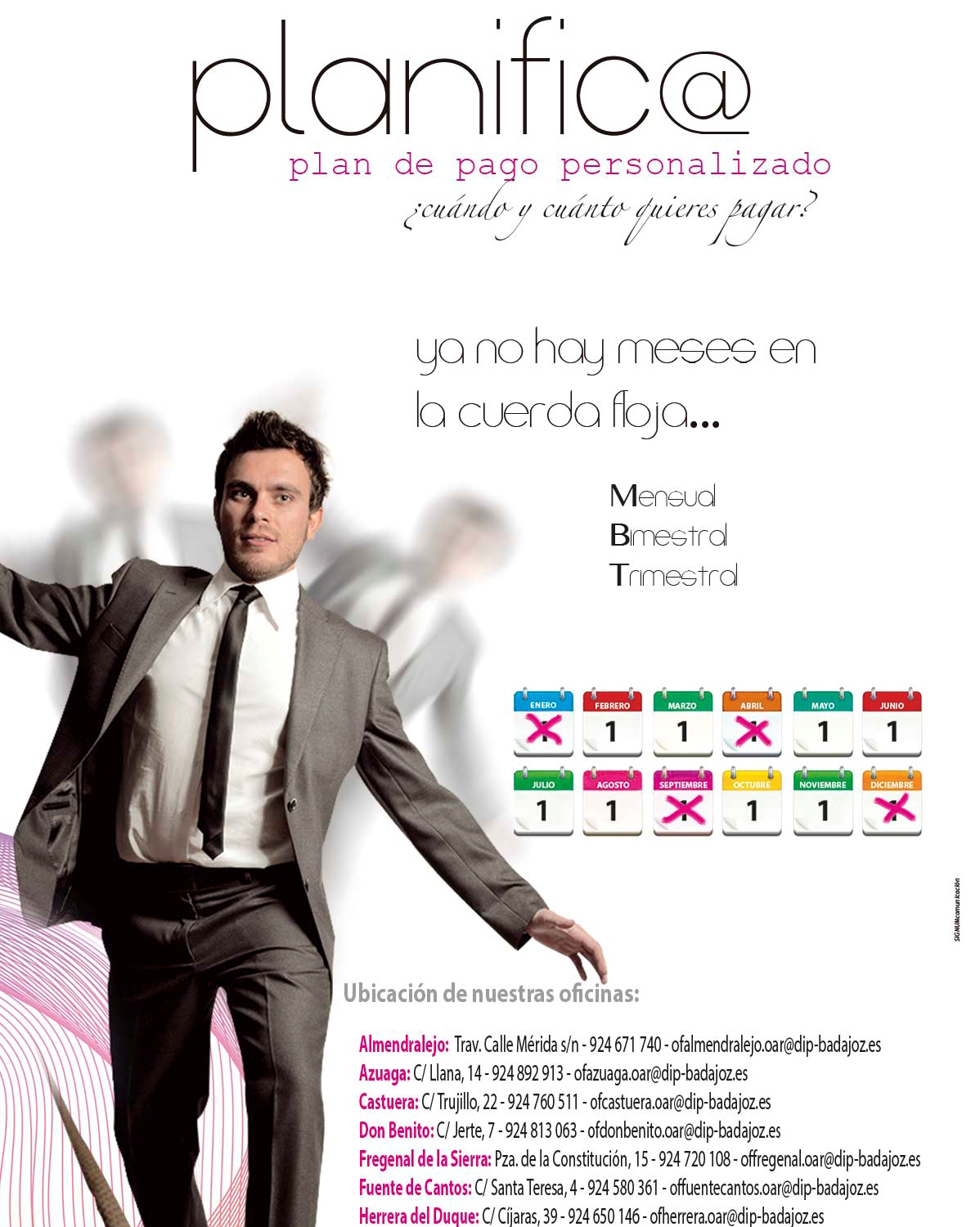 Ya en 2010, el Organismo llevó a cabo acciones que han contribuído a facilitar al ciudadano el pago de sus impuestos, como es el caso de la aplicación del PLAN4 a los recibos domiciliados de IBI Urbana fraccionado en cuatro plazos sin intereses, así como de la flexibilización en las condiciones de concesión de aplazamientos y fraccionamientos de deudas. De estas medidas se han visto beneficiados más de 100.000 contribuyentes de la provincia, exceptuando la ciudad de Badajoz por no asumir la delegación de sus tributos en periodo voluntario.