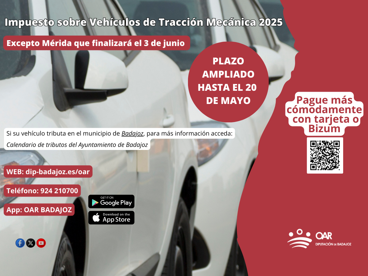 El Organismo Autónomo de Recaudación de la Diputación de Badajoz informa de la ampliación del plazo de pago voluntario del Impuesto sobre Vehículos de Tracción Mecánica (IVTM) hasta el 20 de mayo de 2025, excepto en la ciudad de Mérida, que finaliza el próximo día 3 de junio, no afectando estas fechas a la ciudad de Badajoz ni a sus pedanías.