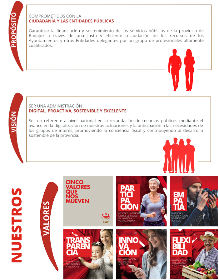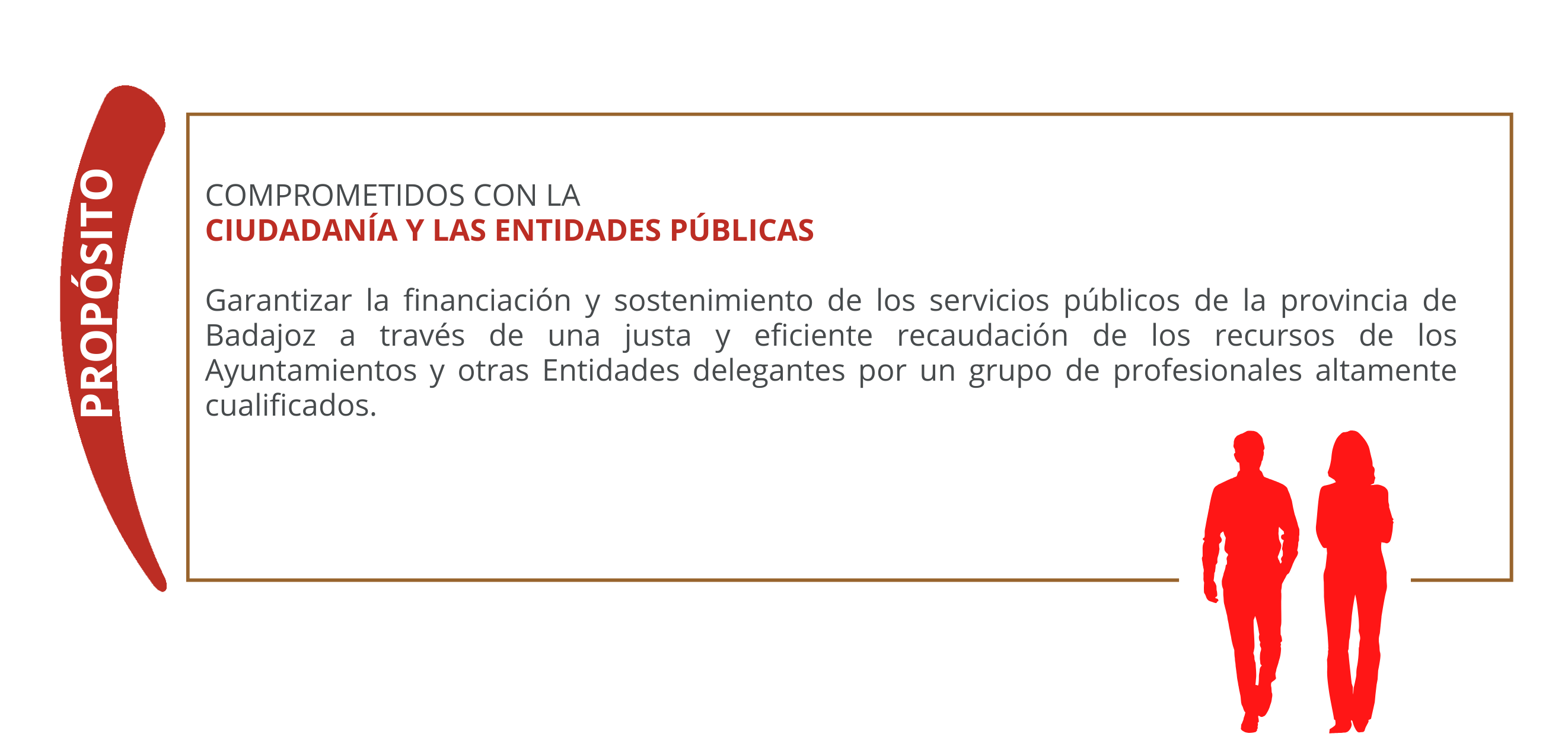 Somos un Organismo autónomo local de recaudación autofinanciado y dependiente de la Diputación de Badajoz, creado en 1990, con carácter administrativo y sin ánimo de lucro. Nuestra Misión está centrada en prestar un servicio de gestión, recaudación e inspección de los tributos y otros ingresos de los Ayuntamientos y otras Entidades delegantes y facilitar el cumplimiento de las obligaciones tributarias a la ciudadanía. Por ello, trabajamos para procurar un servicio integral y eficaz orientado a la implicación de la sociedad en la contribución al gasto público y en consecuencia al sustento de la economía de los municipios.